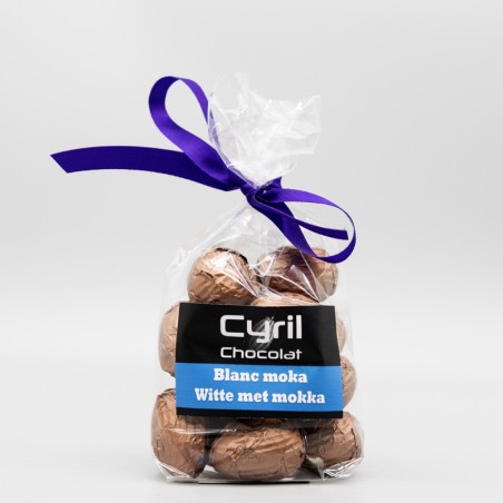 Un sachet de 100 grammes de petits œufs au chocolat blanc, fourrés à la crème au beurre au café Brésil de chez Arduina.