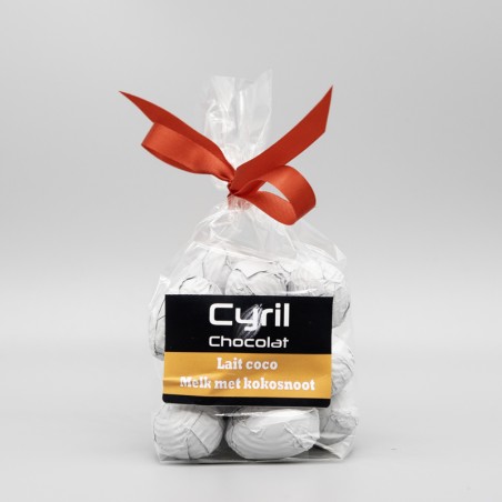Sachet de 100 grammes de petits œufs au chocolat au lait, fourrés à la crème à la noix de coco râpée.