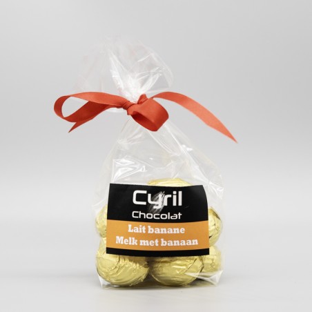Sachet de 100 grammes de petits œufs au chocolat au lait, fourrés d'une crème liquide à la banane.