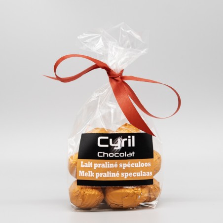 Sachet de 100 grammes de petits œufs au chocolat au lait, fourrés au praliné et au spéculoos.