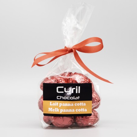 Sachet de 100 grammes de petits œufs au chocolat au lait, fourrés d'une goutte de purée de fraises et d'une onctueuse crème à la vanille naturelle.