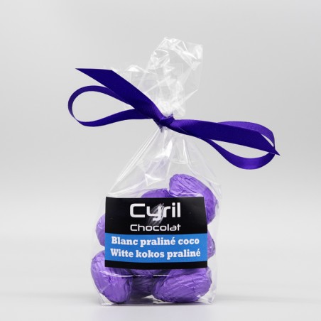 Un sachet de 100 grammes de petits œufs au chocolat blanc, fourrés au praliné et à la noix de coco.